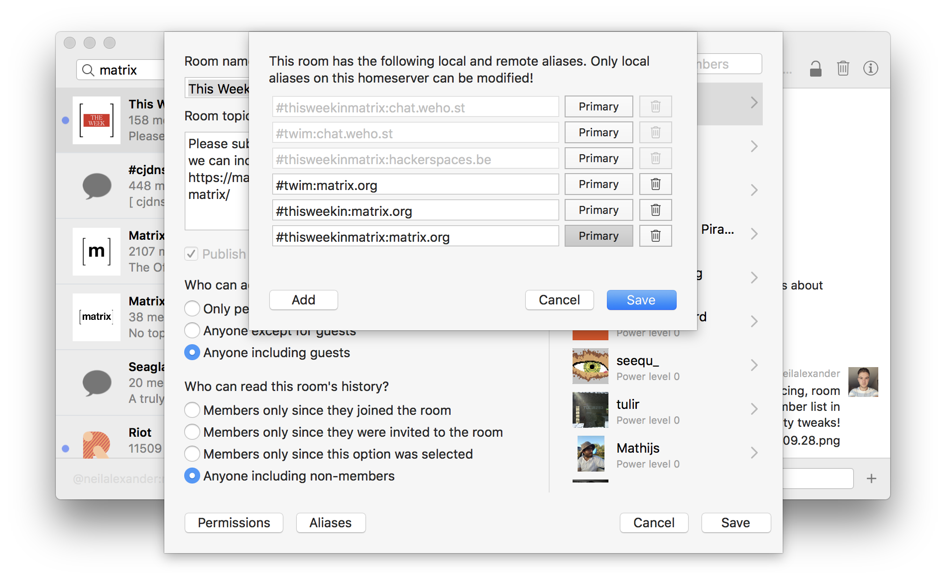This is not from this week at all, other than that it was new information to me. Actually it's ancient, matrix-wise, but I think it's interesting for those who don't know! Although Riot doesn't have an interface for adding custom room tags ("Favourites" and "Low Priority" come by default), Matrix supports arbitrary strings as room tags, and will display them if you add them via another CS API call. To facilitate this TravisR created a small script, tag_room.sh, which makes it very simple to set your own room tags.
