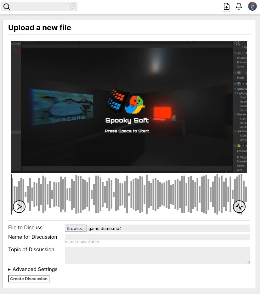 - Added upload previews for PDFs and audiovisual media, so you can confirm you're uploading the right thing before creating a discussion.